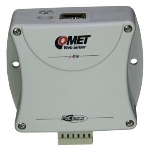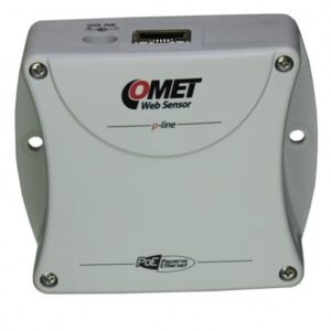 Jednokanálový snímač p-line Web Sensor pro digitální sondu teploty a případně relativní vlhkosti (maximálně 2 měřené veličiny). Komunikace prostřednictvím sítě Ethernet.