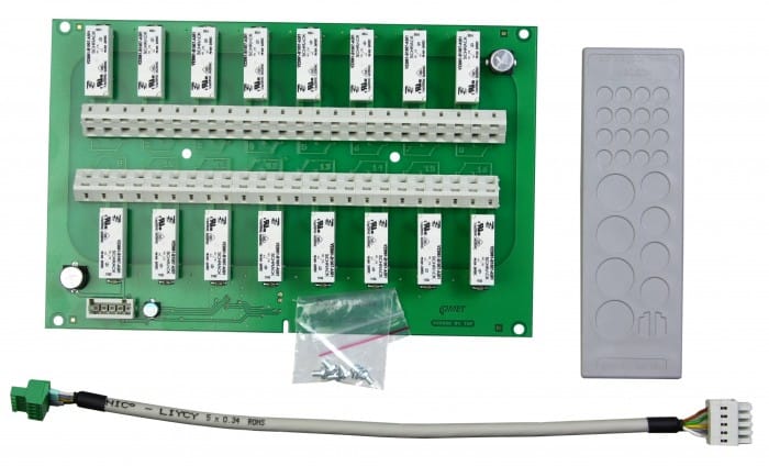 Modul výstupních relé. Obsahuje 16 síťových relé, maximální napětí 50V AC/75V DC s přepínacím kontaktem, z nichž každé může být spínáno na základě vzniku jednoho nebo více alarmů na různých vstupních kanálech podle nastavení pomocí obslužného programu.