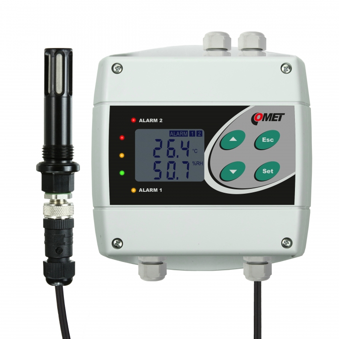 Snímač a regulátor teploty a vlhkosti se dvěma reléovými výstupy. Se sondou T+RV z tvrdého eloxovaného duralu na kabelu pro měření vlhkosti tlakového vzduchu až do 25 barů. Venkovní i vnitřní použití.