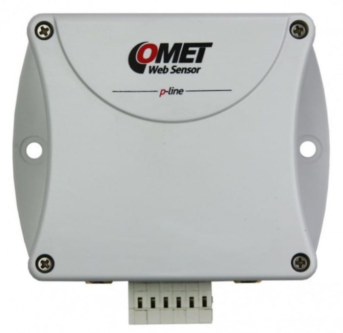 Snímač Web Sensor řady p-line pro měření teploty a relativní vlhkosti vzduchu a 3 binární vstupy pro snímání dvoustavových veličin.