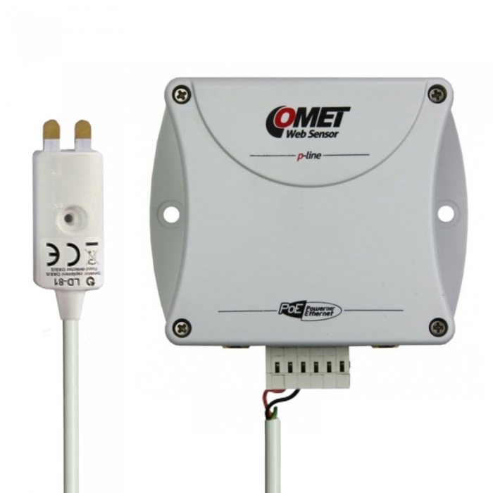 Snímač Web Sensor řady p-line pro měření teploty a relativní vlhkosti vzduchu, s připojeným detektorem zaplavení a binárními vstupy pro snímání dvoustavových veličin. Napájení PoE.