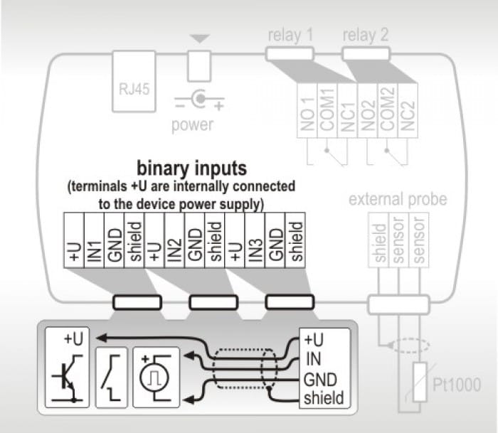 Detektor zaplavení, dvoustavový výstup, připojitelný do binárního vstupu.